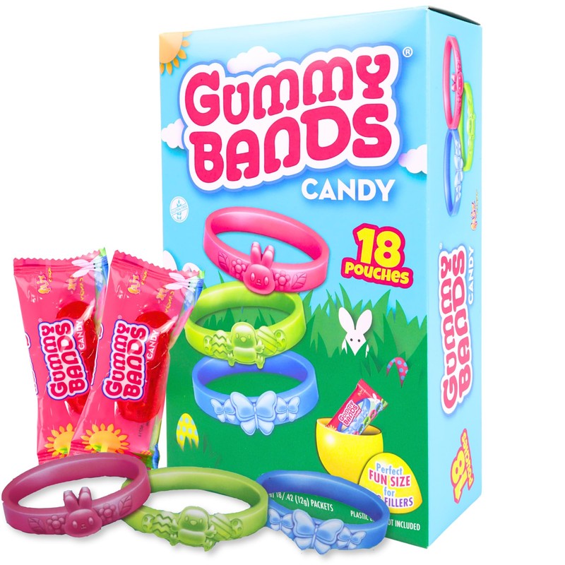 Gummy Bands Candy Bracelets, Individually Wrapped for Easter Egg Fillers and Parties, 18 Pouches