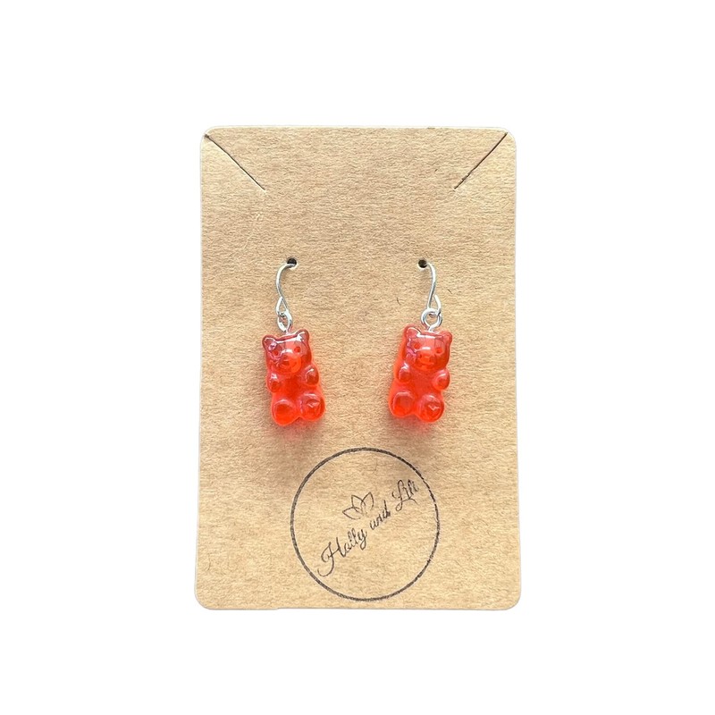 Gummy Bear Novelty Style Dangle & Drop Earrings, 9 Variations, Gummy Bears, Teddy Bear Charms, Cuddly bear earrings, Hooks (Red)