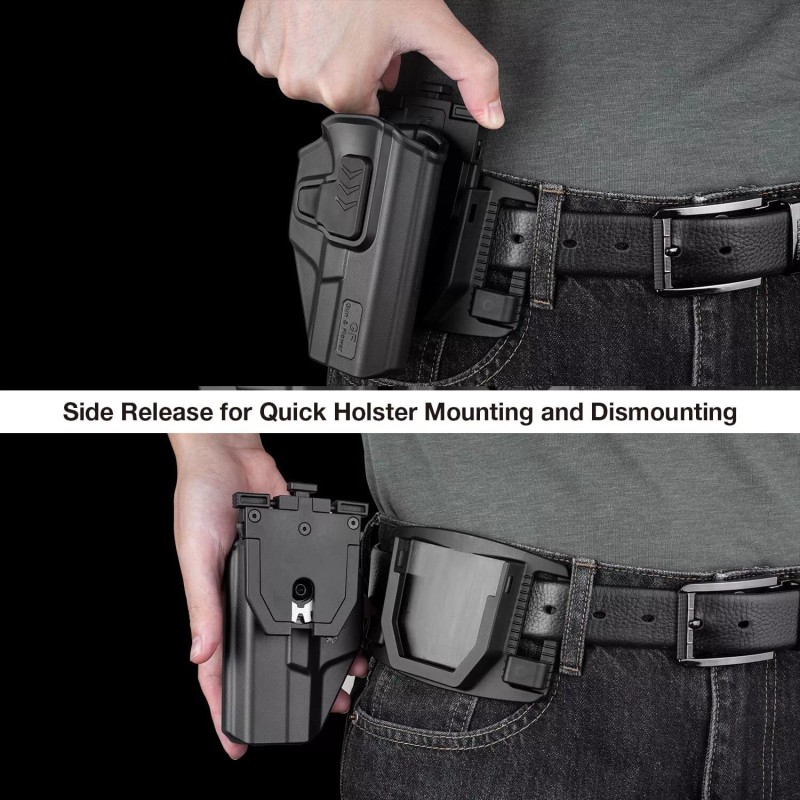 Simply press the top and rotate the holster to the angle you want. It's 360-degree adjustable. No need to spend time finding tools to adjust the holster.