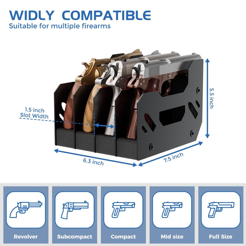 - PRODUCT DIMENSIONS: The 4-pistol storage rack measures 6.3"W x 7.5"D x 5.5"H, with each gun slot measuring 1.5" wide. ***NOTE*** Please check the product dimensions and compatibility with your safe and firearms carefully before purchasing to ensure a proper fit. If you’re not completely satisfied with your pistol rack, please reach out to us, and we’ll ensure you receive a prompt and satisfactory solution.