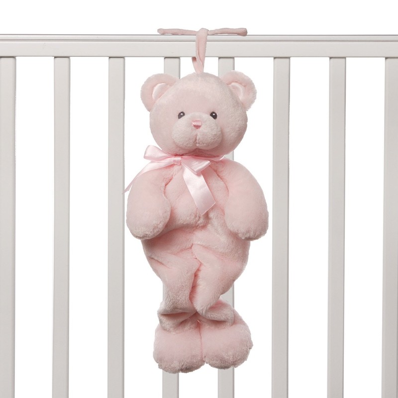 The Pink My First Teddy Bear Musical Pullstring Crib Hanger by GUND is just what a baby needs to fall gently asleep in no time at all. When the pink teddy bear's legs are pulled down with the plastic pullstring handle it softly plays part of Brahms' Lullaby. As the tune plays, the legs slowly ascend back toward the pink teddy bear's body. A sturdy pink tie on the teddy bear's head allows for easy attachment to a crib, stroller, or anywhere else that a baby might want some pre-nap entertainment. Measuring thirteen inches long when fully extended, this musical pink teddy bear has little black embroidered eyes and a pink stitched nose for safety and also has a cute pink ribbon around its neck. Just let the Pink My First Teddy Bear Musical Pullstring Crib Hanger work its soothing magic and watch as baby drifts into a peaceful and refreshing sleep. It's a delightful relief for parents and babies alike! For over 110 years, GUND has been crafting top quality pink teddy bears and other unique stuffed animals designed for both playing and collecting. The name GUND is known worldwide for its high quality, heirloom level plush animals that appeal to all ages. As with all of GUND's stuffed animals, the Pink My First Teddy Bear Musical Pullstring Crib Hanger is made of high quality, child safe materials and is rigorously tested to ensure it meets or exceeds all US safety standards. Recommended for ages birth and up, surface washing is suggested for this musical pink teddy bear crib hanger.