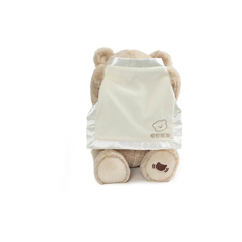 The Baby GUND animated Peek-a-Boo Bear is a cute and super-soft friend who’s always ready to share giggles and a fun game of peek-a-boo with baby! This adorable tan 11.5” teddy bear plush animal features a classic design and a mouth and arms that move up and down during play. At the push of a button, the bear recites one of six different phrases and hides behind the satin-accented blanket, before popping back out to delight baby with a surprising interactive game of peek-a-boo. This bear is surface washable for easy, convenient cleaning and appropriate for ages 0 and up. Ships in a protective poly bag. The baby dolls, infant toys, and stuffed animals in the Baby GUND collection are all crafted with baby’s safety in mind and make the perfect baby shower gifts, as well as nursery and home décor.