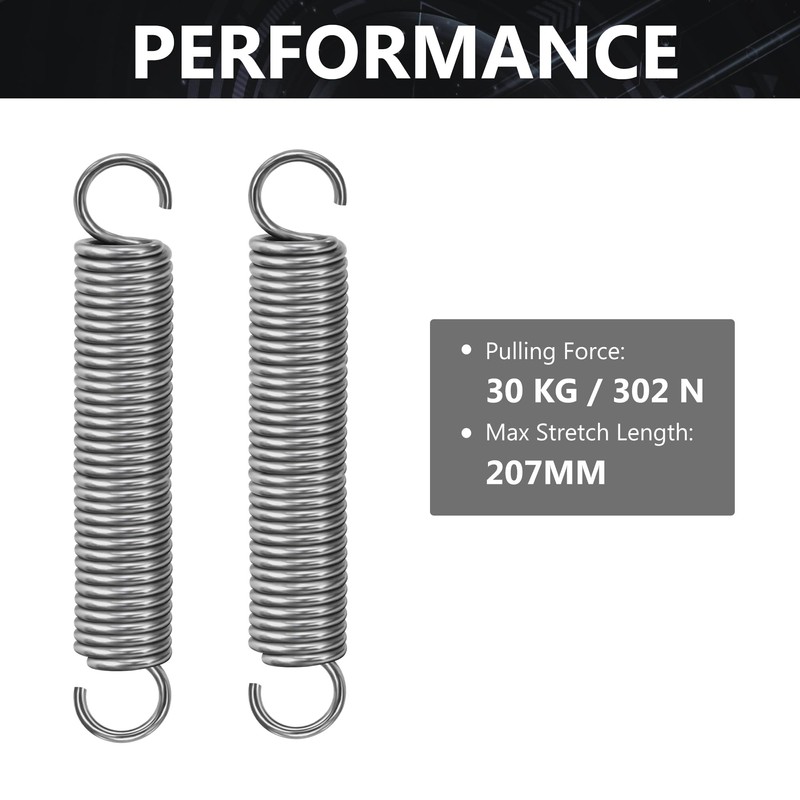 - Performance: the surface of the spring is polished, smooth and burr-free. Maximum spring force: approx. 30 kg (302 N). Maximum pull length: 207 mm.