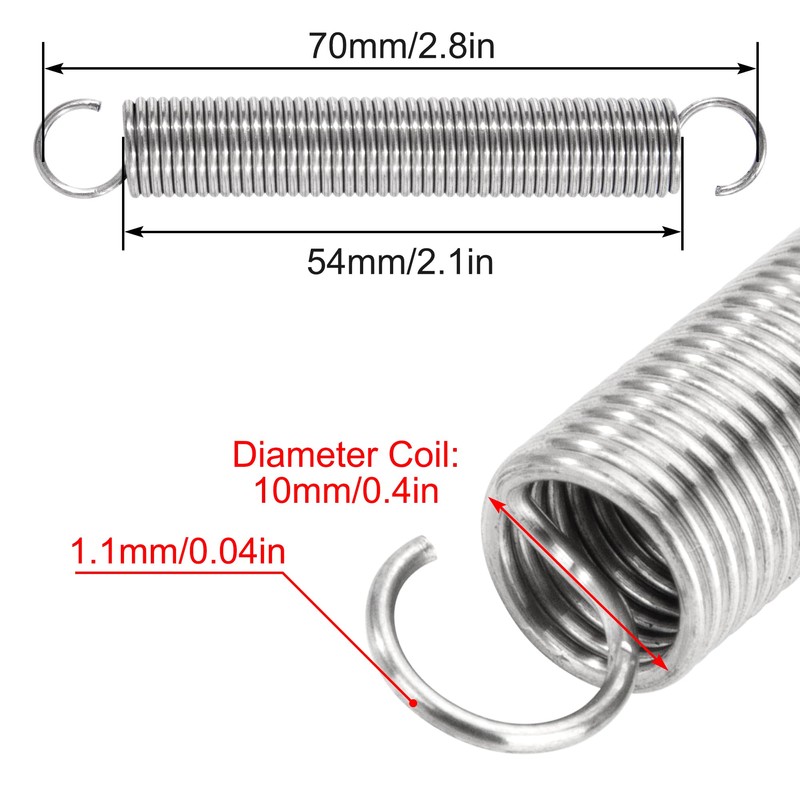 • Specification: tension spring with hook, wire diameter: 1.1mm, outer diameter: 10mm, static length: 70mm.