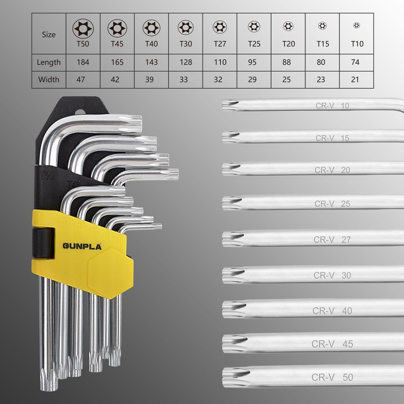 - Gunpla hex keys torx end are crafted from high quality heat treated chrome vanadium steel, with 52-55HRC hardness. Our hex key wrench set is made to produce premium performance, long term and resistant use.