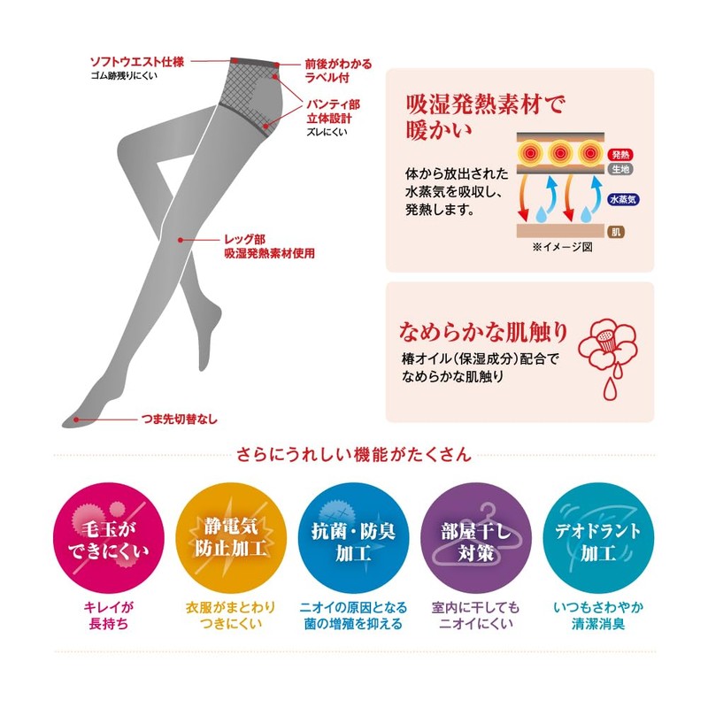 - Moisture wicking and heat-generating materials: The material generates heat when it absorbs moisture, so it absorbs moisture released from the surface of the body and generates heat to keep you warm!
