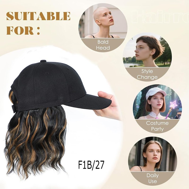 GUOJIAN Hat Wigs for Women 6' Short Wave Baseball Cap Wigs with Curly Hair Extensions Synthetic Wave Wig Adjustable Hat with Hair Attached for Daily Use (1B/27, 6inch)