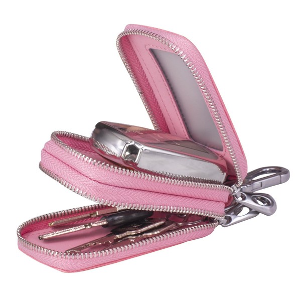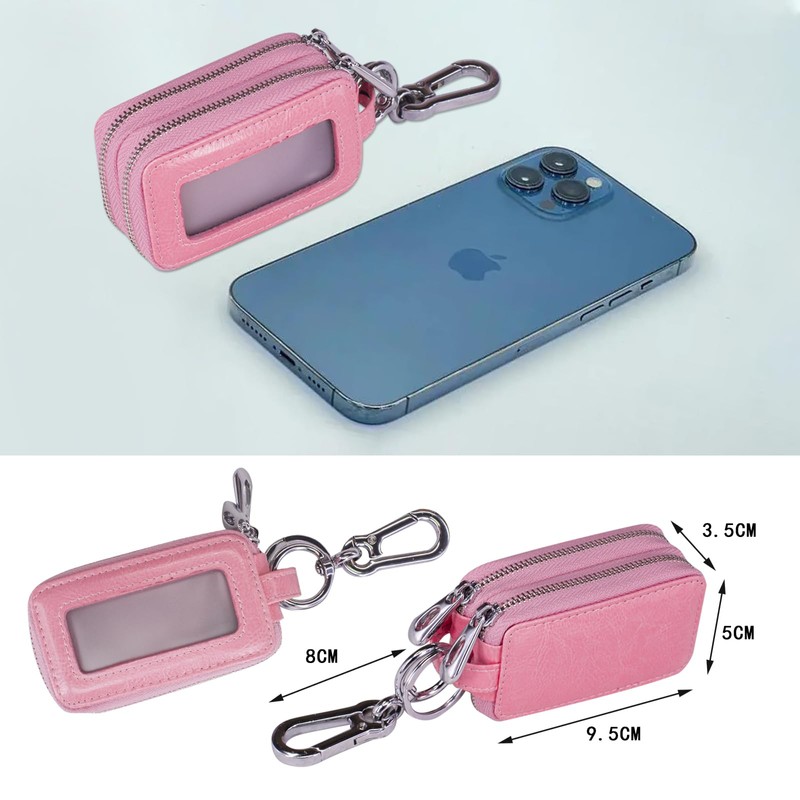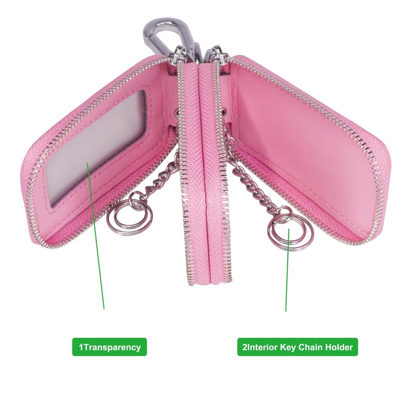 Guolich Car Key Chain Bag Double Zip Leather Protection Key Coin Holder Key Ring with Transparent Window for Car Key Remote Control, pink
