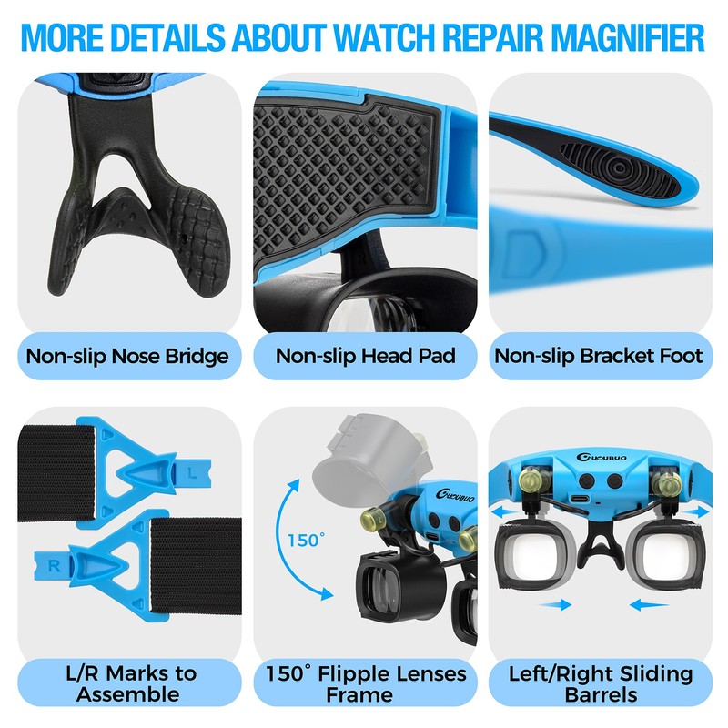 - Compact Design & Multifunction: Non-slip soft and adjustable padding to prevent glasses from falling off and reduce fatigue for all-day wear. A compact carry bag is the good life helper, All accessories including the magnifier and lenses plastic case can be stored neatly. and then you can take it to anywhere you wanna go. It is the Ideal headband magnifier trusted by jewelers, watchmakers, scale modeler, hobbyists.