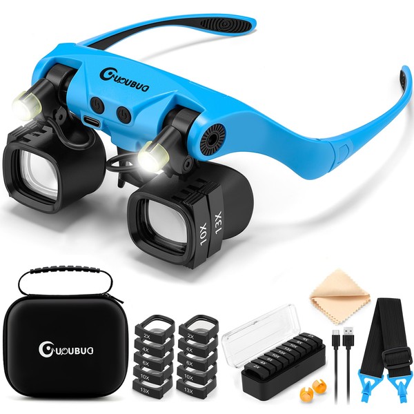 GUOUBUO Magnifying Glass with Light, 2X 4X 6X 10X 13X Magnifying Glasses Lens, Switchable Binoculus Loupe w/Storage Case, Rechargeable Head Mount Magnifier for Close Work Watch Repair Crafts Jewelry
