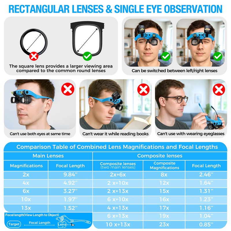 - Single Eye Observation: Our binoculus head magnifier is designed with two lenses frame which is switchable, focal length range from 0.85" to 9.84" for most close work. For the high magnification, we do recommend you stay closer to the target observation object with one single eye at a time(Using both eyes simultaneously can produce blurring, affecting the magnification effect)You can switch to single use the left lens after your long time working with right lens to reduce eye strain and enhance work efficiency.