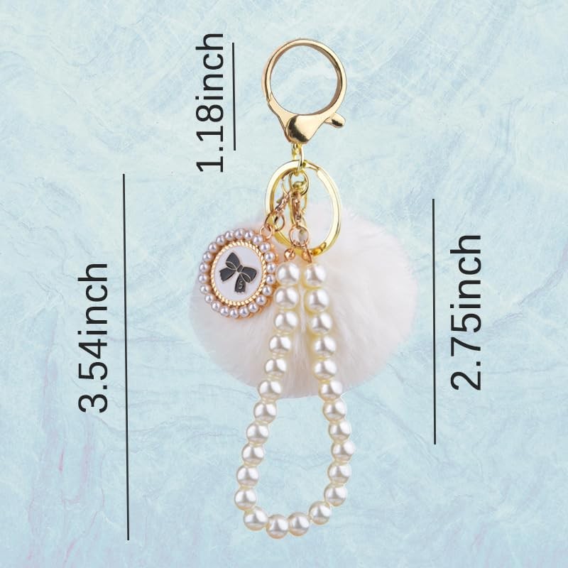 - Size for Wristlet Pom Pom Key Chain for Girls Women: The total length of the pearl bow wristlet key ring is about 5.31 inches and the bow charm is about 1.18 inches long, this size is just right for the bag and the key, easy to hold in hands, beautiful to hang on the bag, faux fur pom pom keyring for women girls
