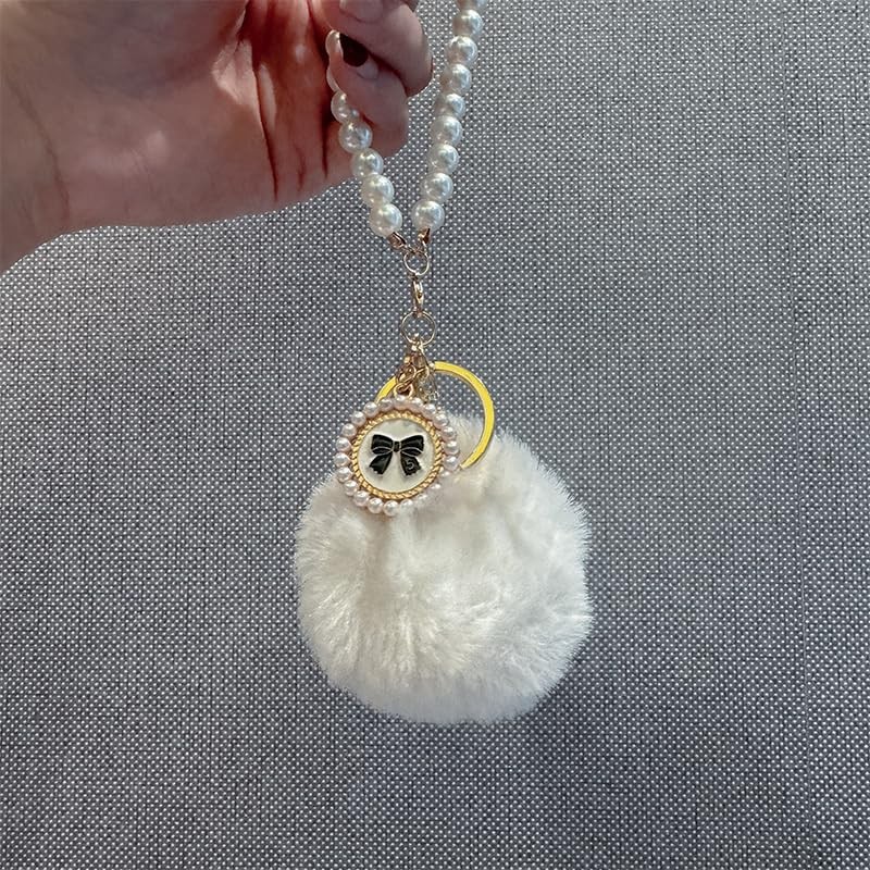 - White Wristlet Pompom Keyring Fluffy: The pearl bow keychian is cute and exquisite, includes a chain of artificial pearls, a small charm printed a bow and a white fluffy ball, as well as a key ring and a lobster clasp, perfect for either hanging keys or hanging on your bag, bracelet fluffy pom pom keychain for women girls