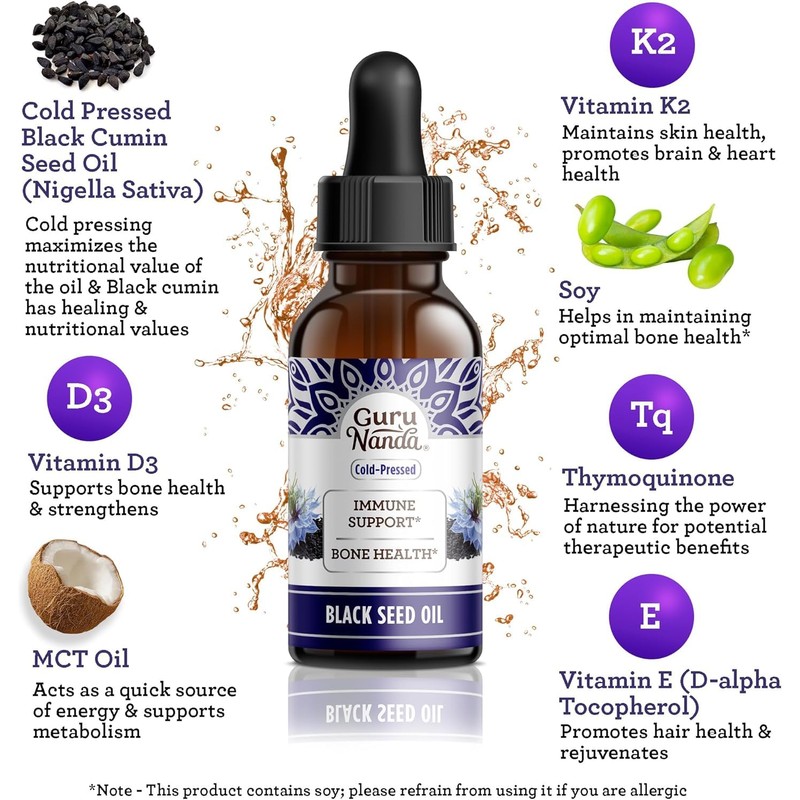Derived from the versatile herb Black Seed (Nigella sativa), also known as "Kalonji," this GuruNanda Black Seed oil offers multiple benefits to support the body's natural defenses. Enriched with the goodness of Vitamin D & K2, this potent combination maximizes health advantages, including immune support, bone health & GI well-being.