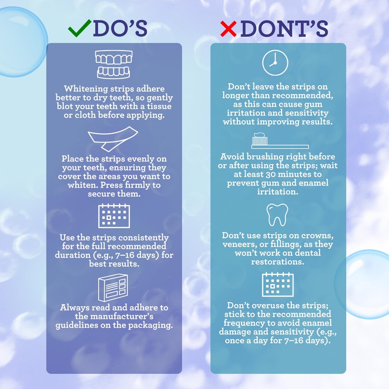- Our strips offer superior adhesion for hassle-free application & stay put for up to 2 hours for effective whiter teeth. For best results, avoid eating, sleeping, or smoking while using the strips.