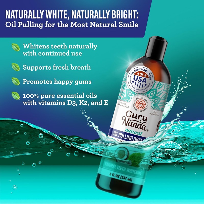 - COCOMINT FORMULA: Upgraded GuruNanda Cocomint Pulling Oil, which contains an ayurvedic blend of fractionated coconut oil, seven pure, natural, & ethically sourced essential oils, and Vitamin D3, E, and K2. The seven different globally farmed essential oils are peppermint, spearmint, cardamom, fennel, clove, oregano, and tea tree oils. This authentic blend of oils with vitamins is a natural teeth whitener oral rinse that helps freshen your breath and supports healthy gums.