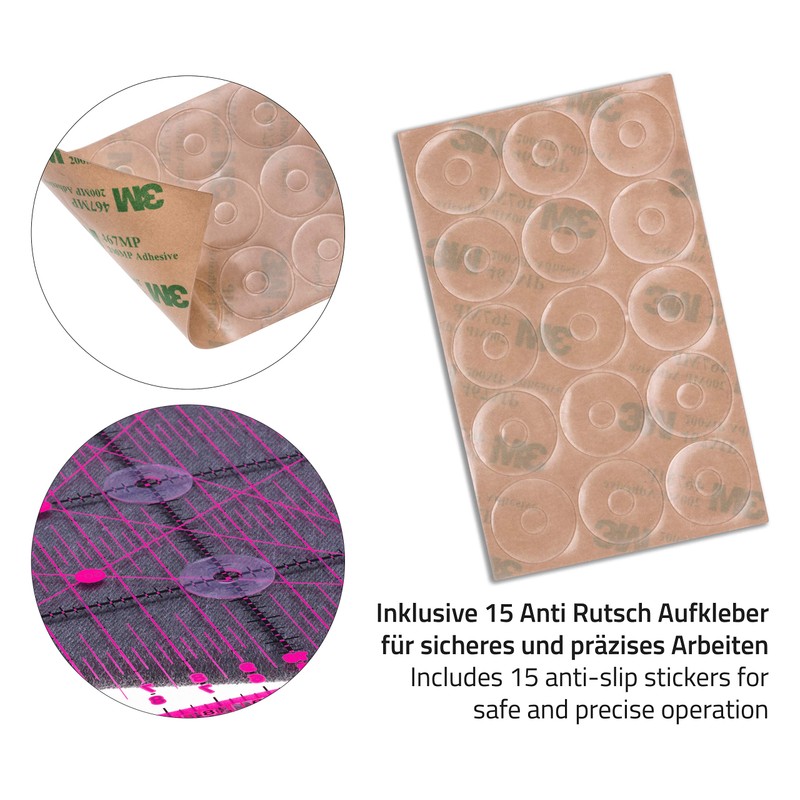 - No slipping – each patchwork ruler comes with 15 free non-slip stickers. Straight cuts become a breeze.