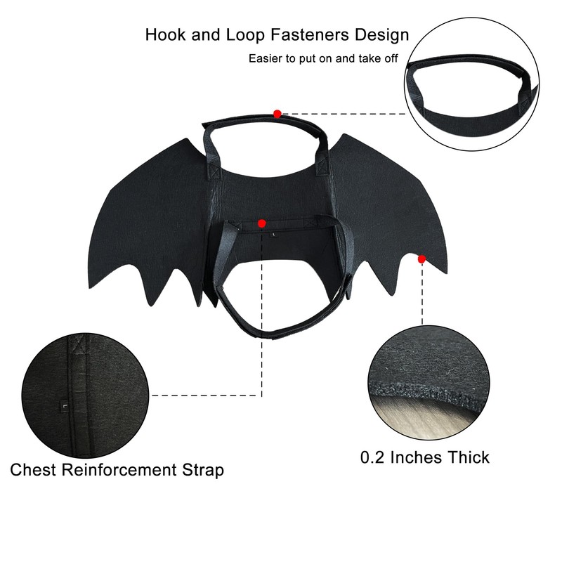 - Hook And Loop Fasteners Design: Our bat wings for dogs have a hook and loop fasteners design on the chest and neck that can be adjusted to suit different pets