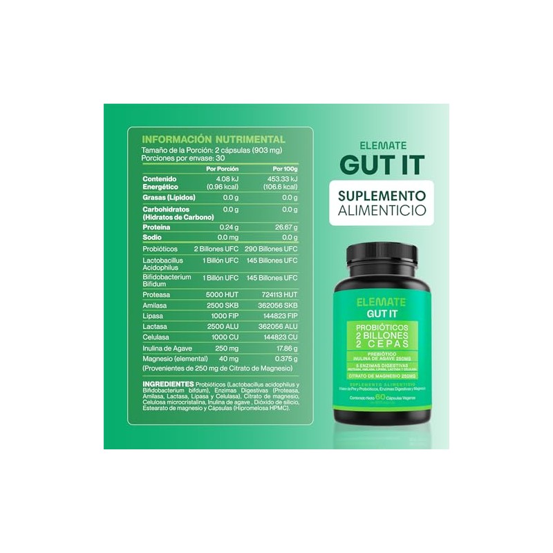 Gut it Probiotic Suplemento Natural Probiticos, Prebiticos, Enzimas Digestivas, Citrato de Magnesio 60 Cap Veganas Apoyo Digestivo Elemate