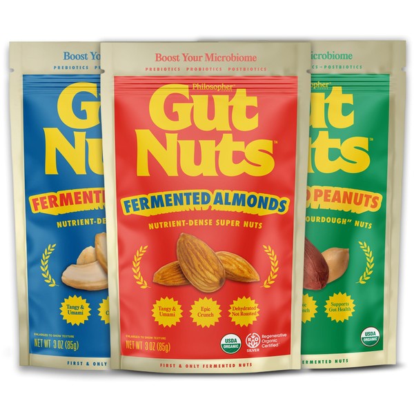 Gut Nuts Fermented Almonds, Cashews, Peanuts Variety Pack (Pack of 3) Healthy Nut Snacks