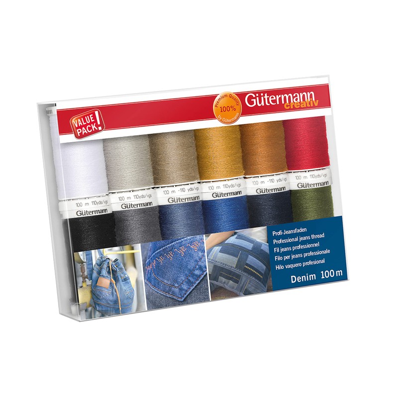 - 12 spools of professional denim thread 100 m in the typical denim quilted colours. Denim fabrics are not only in the denim fashion trend. Authentic, robust and with its characteristic casualness, denim also makes bags, backpacks, cushion or vase cases cool accessories. With the denim thread 100 m from Gütermann Creativ everyone can now be creative themselves, just as stylish and durable as the professionals