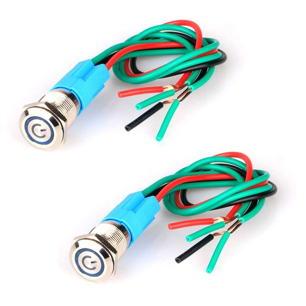 GUUZI 2pcs Latching Push Button Switch Waterproof Stainless Steel Shell 220V-230V/3A LED Ring Illuminated Switch with Wire Socket Plug Suitable for 12mm Mounting Hole (Blue)
