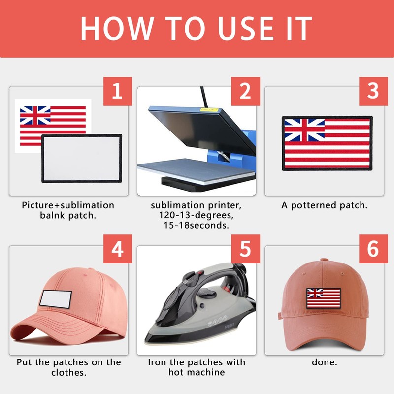 - The application process is easy: first print the patterns you want on the smooth surface of the sublimation blank hat patches, then put the patches on the clothes, and iron the patches with hot machine, 160-200 for 40- 60 seconds; The patches have high temperature glue, which will keep them in place.