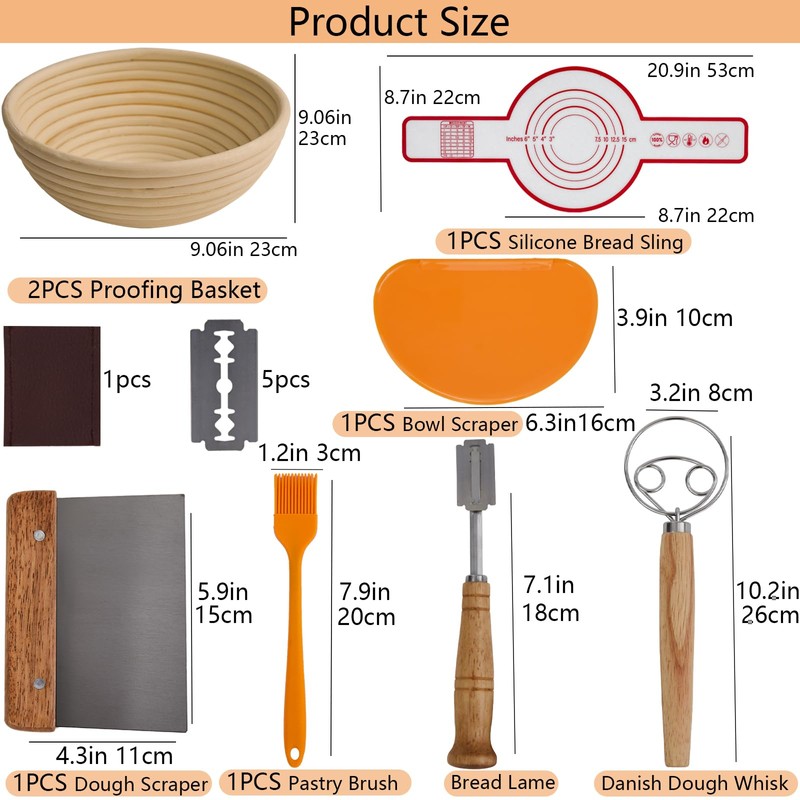 • 7 Types of Accessories:Sourdough proofing basket set provides 7 types of accessories:Sourdough kit Linen Liner,Bowl Scraper,Dough Scraper,Danish Dough Whisk,Bread Lame,Silicone Bread Sling,Silicone Pastry Brush,which meets the tools needed for making dough.