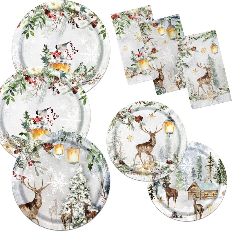 - MATERIAL:Deer winter Christmas plates & napkins are made of paper,reliable and safe to use .The patterns and colors are beautifully printed and do not fade, Let your winter forest theme Christmas winter holiday full of happy atmosphere