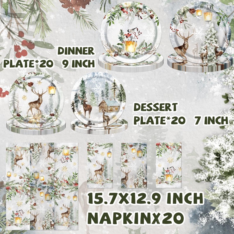 - WINTER DEER DINNERWARE :Are you looking for the winter wonderland Christmas decorations?Look here!The winter holiday plates and napkins dinnerware include 20pcs 9inch winter plates,20pcs 7inch deer dessert plates and 20pcs winter cocktail napkins