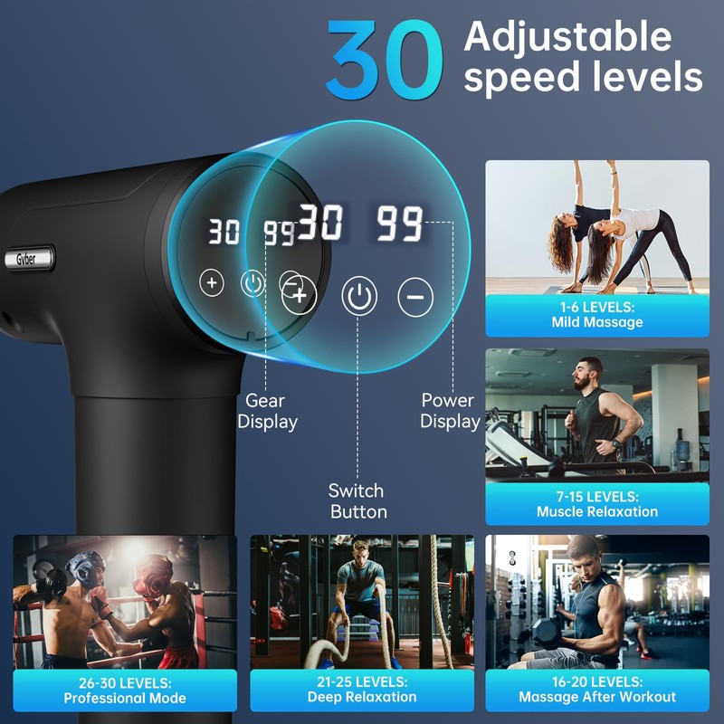 - Features: Built with high-quality materials for durability, this muscle massager gun features a smart LED display showing speed and battery levels, along with a simple on/off button operation