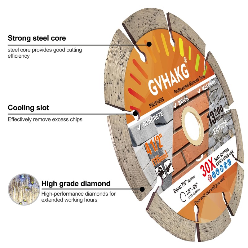 • Application: GVHAKG segmented diamond blades can be used for wet and dry cutting concrete, brick, block, stone, brick and stone material