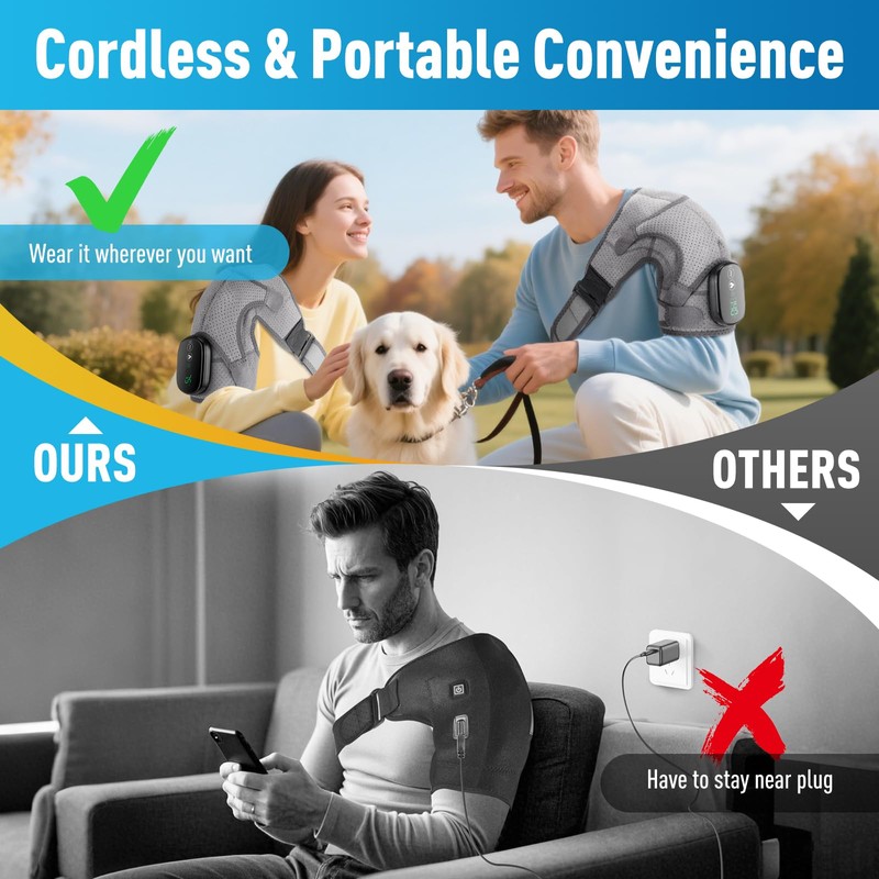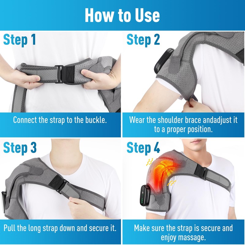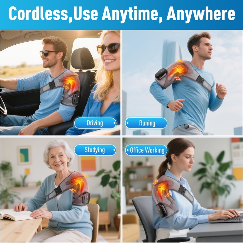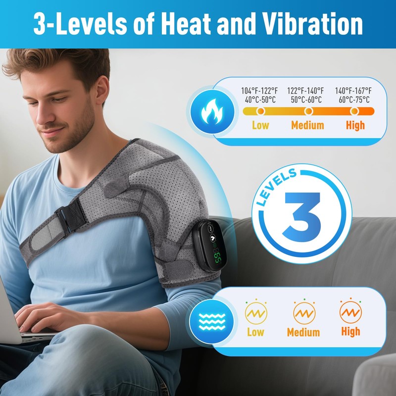 - 【Relieve Shoulder Pain】: This shoulder heating pad with massage can alleviate discomfort caused by arthritis, strains, stiffness, cold weather, and more.The heated shoulder brace helps relax tense muscle fibers, promotes blood circulation, and delivers consistent, gentle heat to effectively relieve rotator cuff. Whether for daily fatigue or chronic discomfort, it provides instant soothing relief and relaxation, helping your shoulders regain ease and vitality