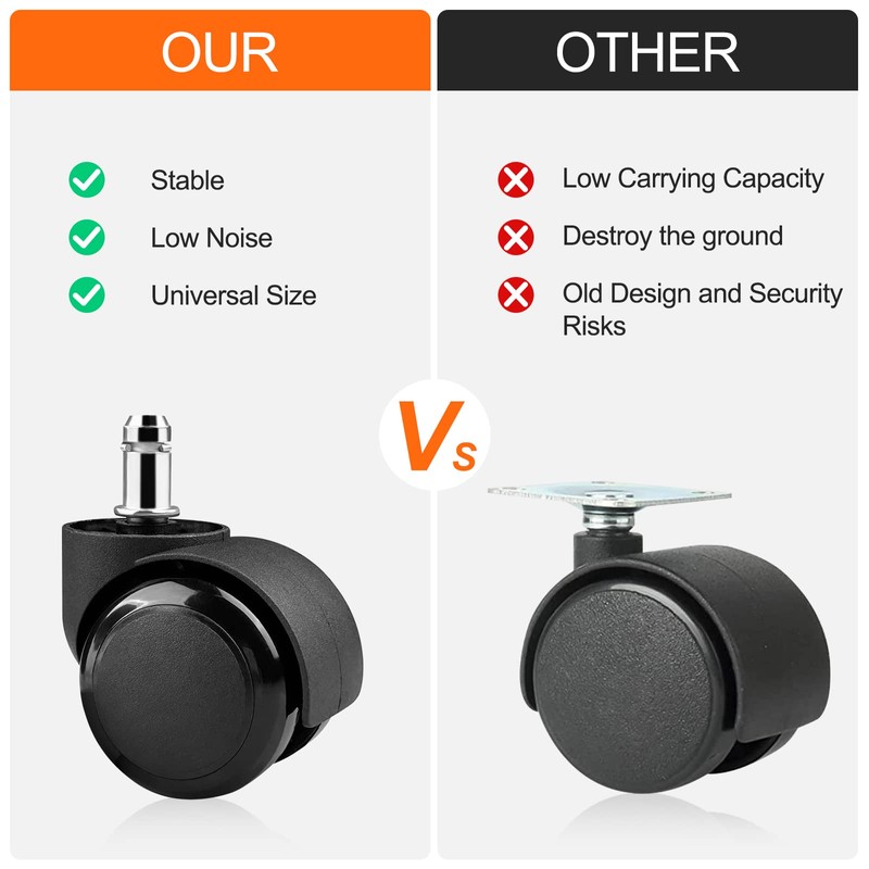 - Easy installation: the office chair castors can be installed manually without annoying disassembly tools. Simply take the old office chair casters and slide the new ones in to assemble. The process takes no more than 3 minutes and significantly improves your work efficiency.