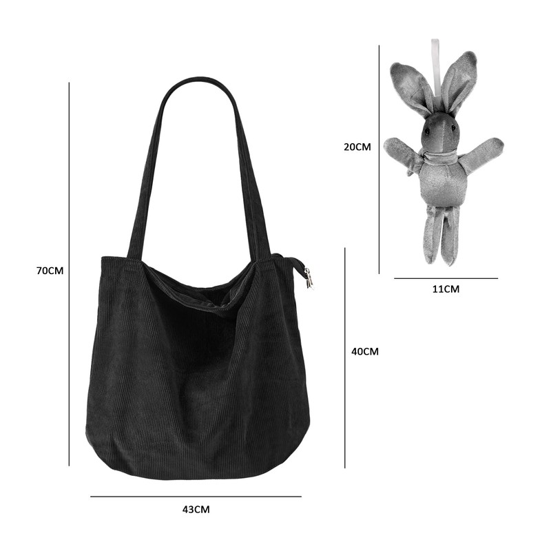 GVSAVY 1 Black Corduroy Bag, With 1 Rabbit Charm, Retro Shoulder Bag, Simple Beach Bag, Casual Large Capacity Shopping Bag, Zipper Handbag