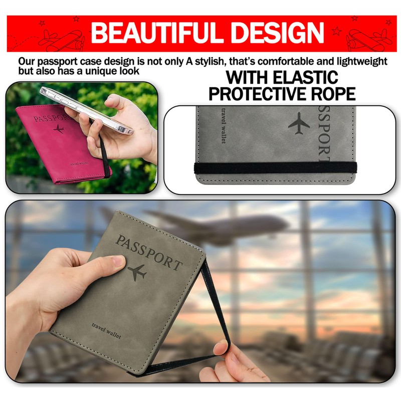GVTECH Cartera para Pasaporte RFID, [2 Pack] Funda para Hombres y Mujeres, Protector de Pasaporte, Viaje Accesorios Mujer (Grey+Pink)