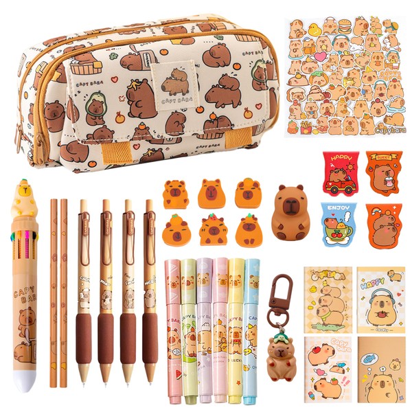 - Complete Capybara Themed Stationery Collection:This value set includes everything a student needs: 1 multi-layer pencil case, 50 adorable stickers, 10-colour ballpoint pens, pencils, gel pens, highlighters, erasers, a sharpener, keyring, magnetic bookmarks, and mini notebooks. All featuring charming capybara designs that make learning fun!
