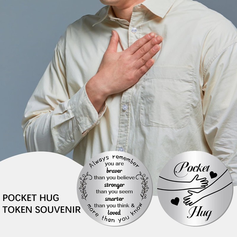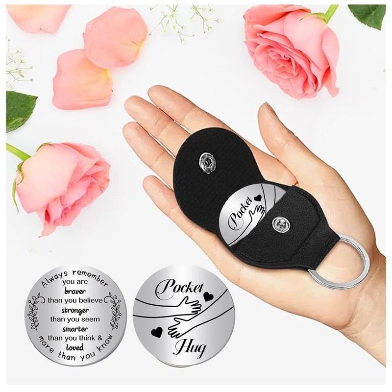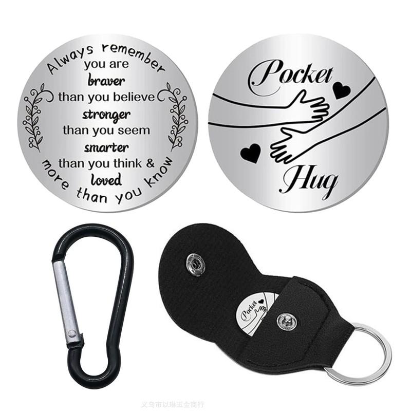 GWAWG Pocket Hug Token Inspirational Long Distance Relationship Keepsake Stainless Double Sided Encouragement Pocket Hug Token Gift with PU Leather Keychain for Friends, Lovers, Family, Silver and