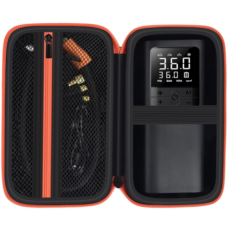 Car Inflator Storage Bag with sturdy bandage design tightly encases the air pump, effectively buffs the shock in case of accidental drops and protects your device from damage. Internal zippered mesh bag design allows you to easily store your charging cables, hoses, nozzles and other components, eliminating the need to worry about losing parts or messing up. The high quality material ensures the durability of the storage bag and will withstand the test of time and provide lasting protection for the air pump.
