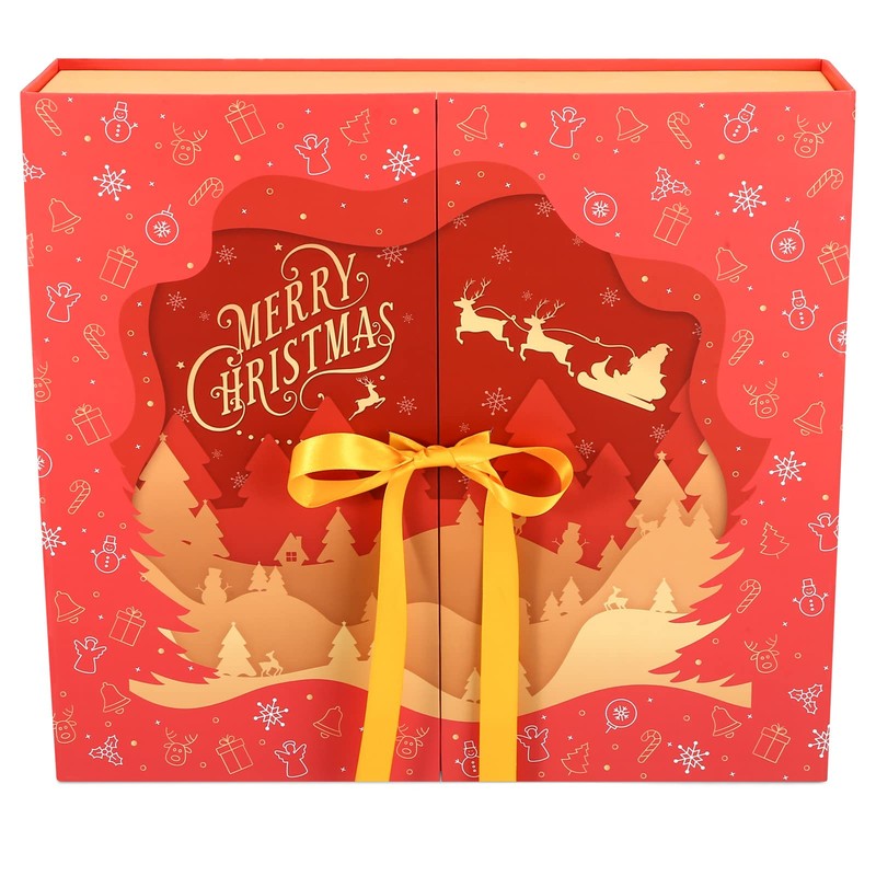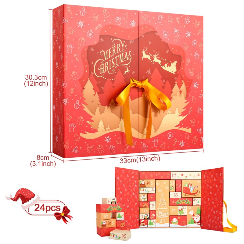 - Color: Christmas red. Each chrsitmas treat box features festive prints to fulfill your kids. This calendar box is luxurious in look, well made and worthy, perfect for gifting.