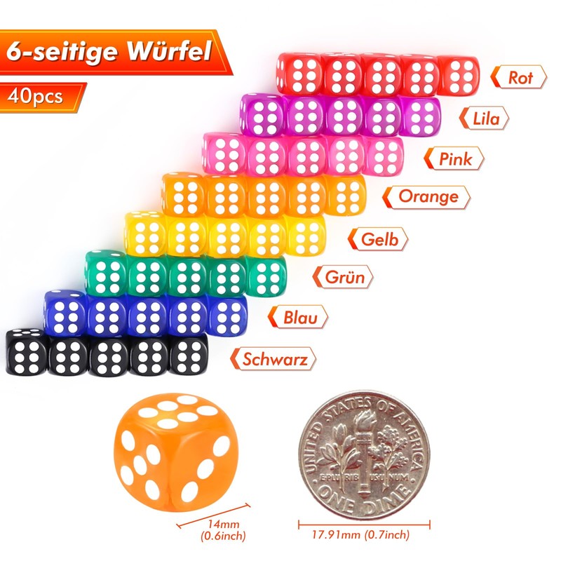 GWHOLE Set of 40 Colourful Dice 6-Sided, 14 mm, Dice Set, Whisper Dice Set wi...