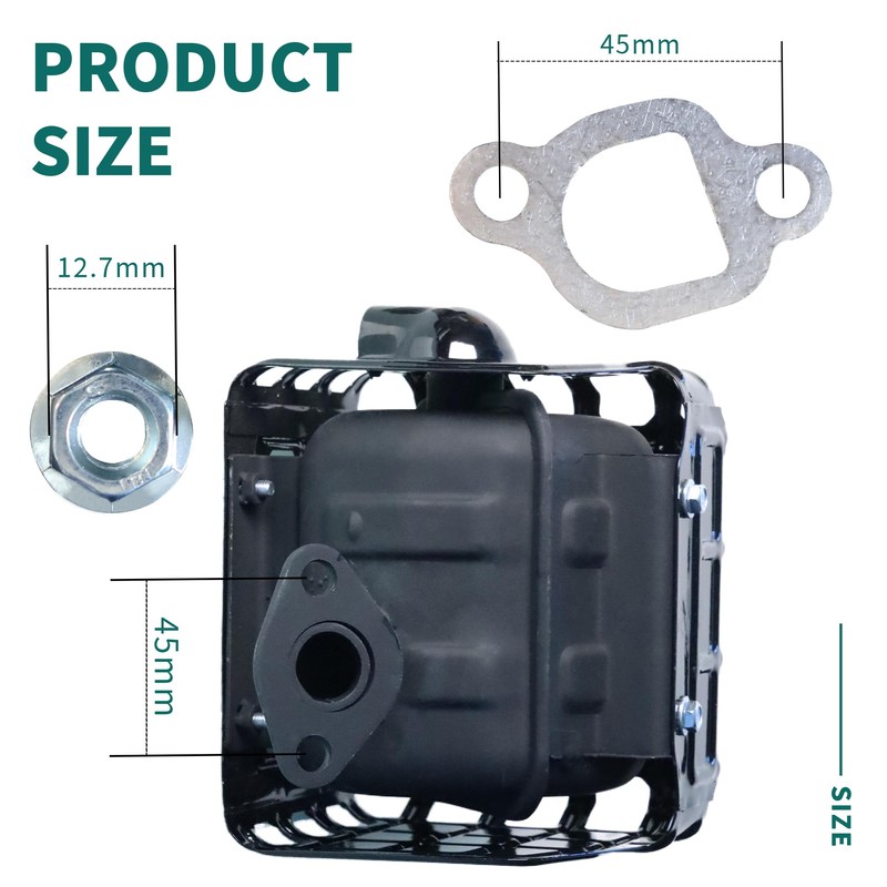 - Package included:1 x Muffler Assembly (Muffler With Shield) ,1 x Muffler Gasket,1 x Spark Plug, 4 x Nuts.