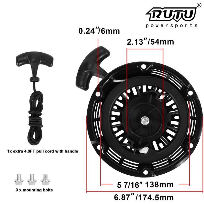 - What you get: 1 x pull starter assembly with straight steel rod jack, 1 x replacement 4.9 foot pull cord with handle, 3 x mounting nuts. Properly install and use for maximum service life