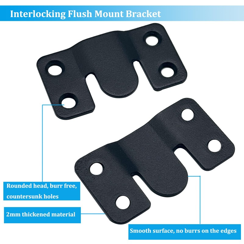 • Thickness Material: Interlocking flush mount bracket made of 2mm thickened material, wear-resistant and anti-corrosion, durable made of stainless steel, smooth surface, anti-rust, strong toughness, bearing heavy, can be used for a long time. Smooth surface, no burrs on the edges. Mounting screws are included in the package.