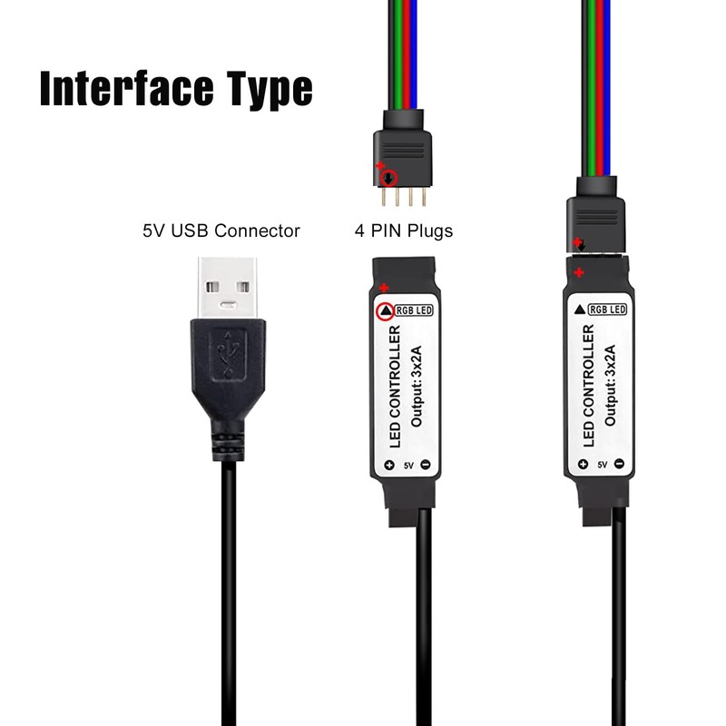 - Package Content: You will receive 2PCS USB led strip controllers with one meters long cable(the cord from the USB plug to the LED controller module), 2 pieces of 24-key remotes, and 2pcs of 4-pin male connectors