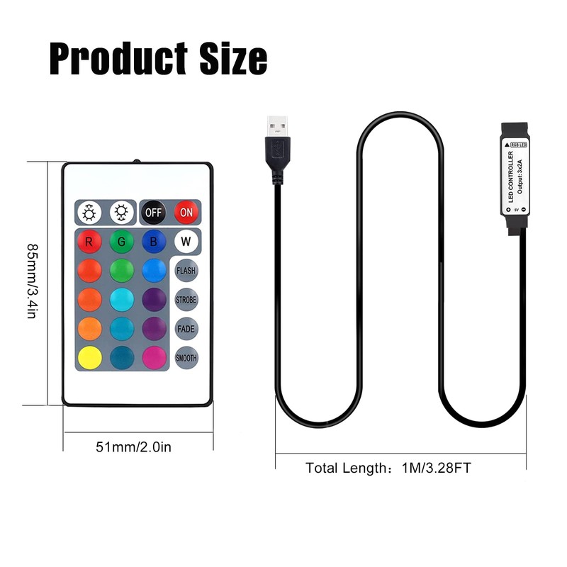 • Package Content: You will receive 2PCS USB led strip controllers with one meters long cable(the cord from the USB plug to the LED controller module), 2 pieces of 24-key remotes, and 2pcs of 4-pin male connectors