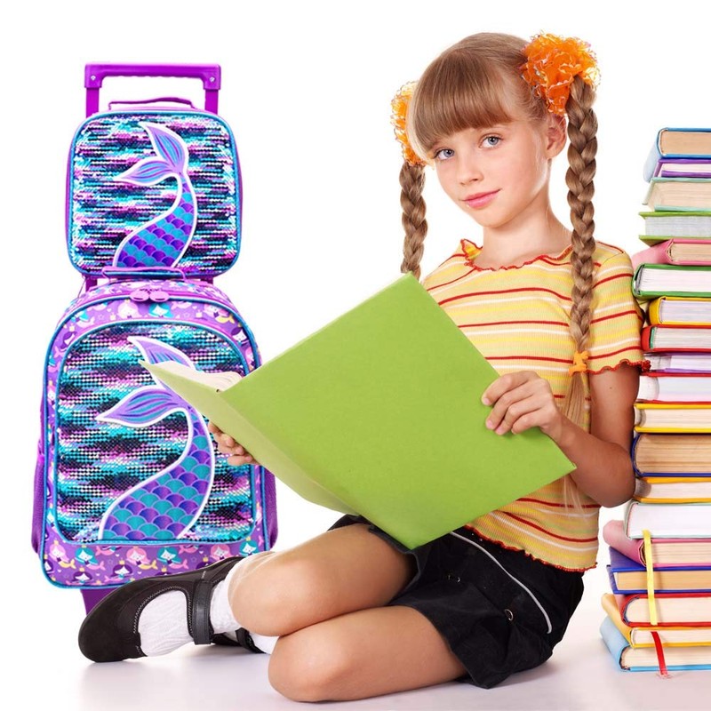 - Girls Rolling Backapck 3 in 1 : Mermaid rolling backpack + lunch box+ pencil case, magic reversible sequin material, smooth zipper, widened and thickened shoulder straps make it feel nice and comfortable.