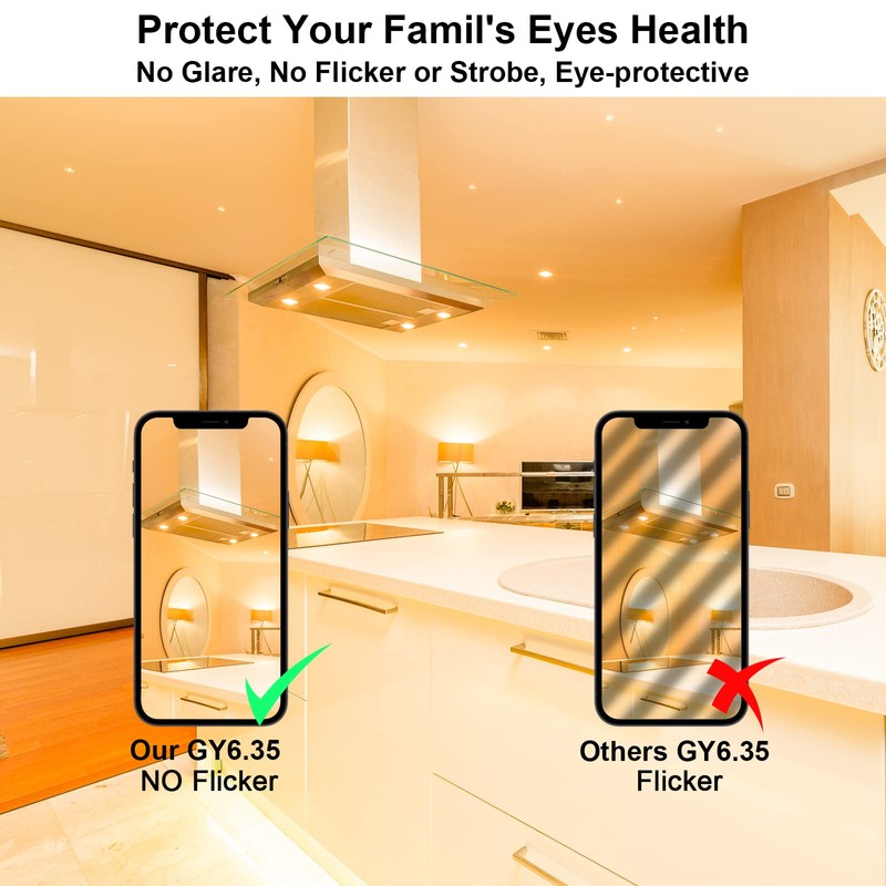 • EYE PROTECTION: DUMILOO GY6.35 light bulbs No-flickering that can't cause fatigue. They maintain a warm white (2700K) temperature, color rendering index CRI100, present object color vividly and clearly, No UV & IR, and take good care of your and your family's eyes.