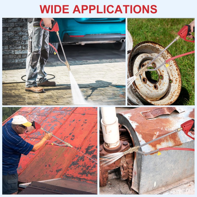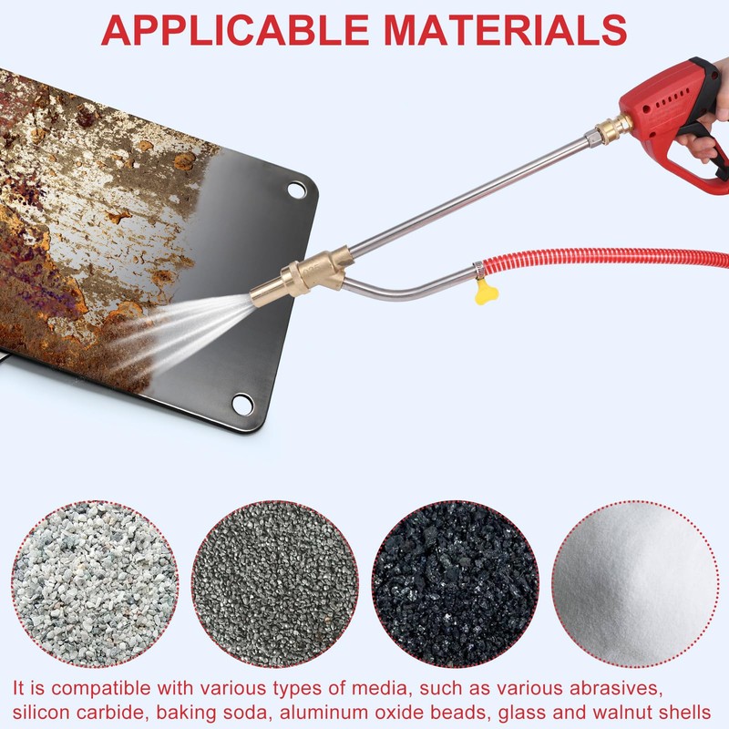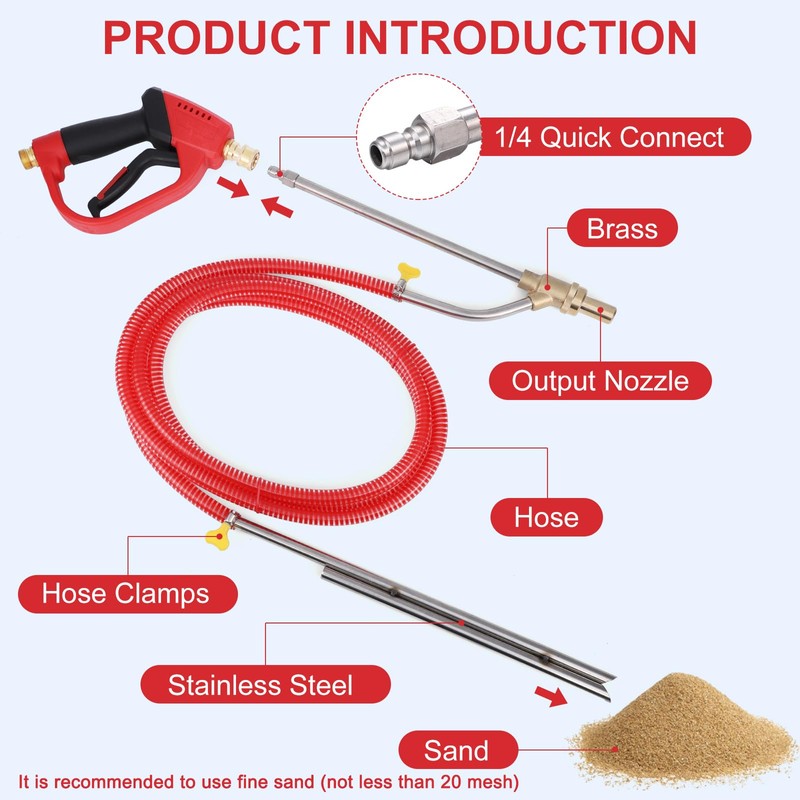 • Easy to Use: The sand gun blasters kit has an operating pressure of 5000PSI, can withstand temperatures up to 140F/60C, and a maximum allowable particle size of 1.5mm. It is recommended to use fine sand (not less than 20 mesh). As the same time, it is also equipped with a 1/4" quick connector and a 9.8ft/3m hose, which can be adapted to most types of high pressure cleaners and high pressure air hose.