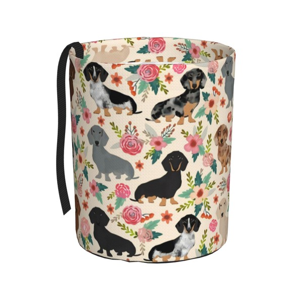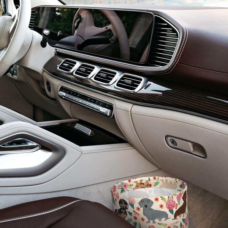GYLILI Dachshund Sausage Dogs Pink Flowers Print Car Trash Can Leak Proof Hanging Waterproof Garbage Can Multipurpose Trash Bin for Car SUV Front Seat Headrest Collapsible and Portable Storage Pocket